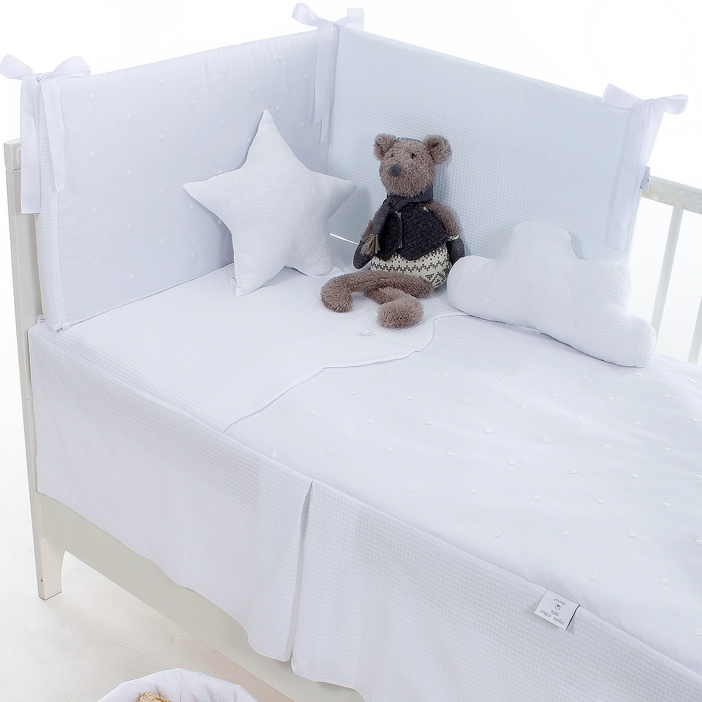 Pack de cuna Uzturre colección Adriana en color blanco para cuna de 60×120 cm, compuesto por nórdico (funda + relleno) y protector desenfundable y reversible. Un conjunto elegante, versátil y seguro, ideal para vestir la cuna durante todo el año con la máxima calidad.