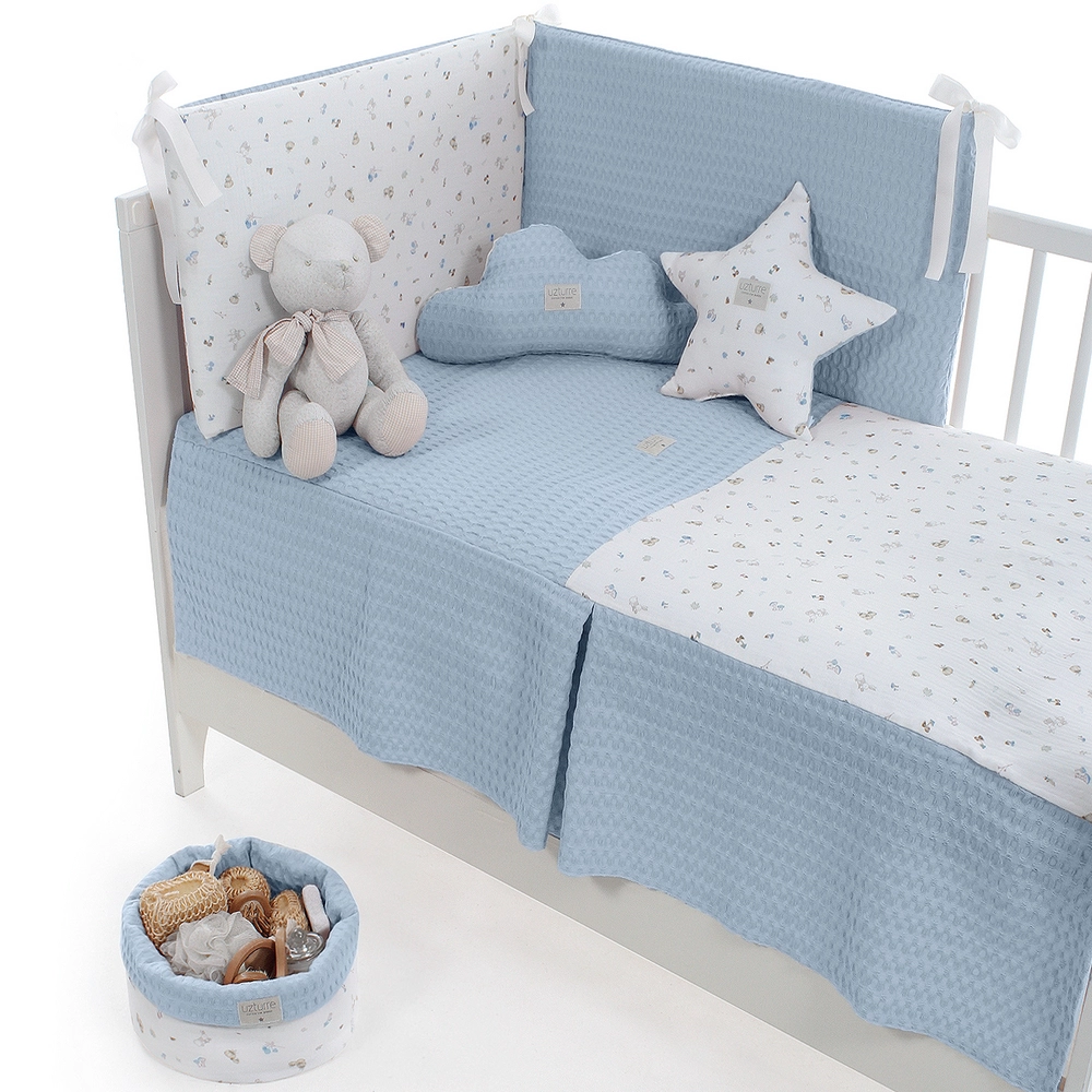 El pack de colcha y protector de la colección Benjamin de Uzturre en color azul empolvado está diseñado para cunas de 60×120 cm. Combina un tejido waffle liso en tono azul suave con un estampado infantil delicado sobre fondo claro, creando un ambiente tranquilo, acogedor y elegante en la habitación del bebé. El conjunto incluye colcha con relleno y protector a juego, ambos desenfundables y lavables. No incluye almohada.