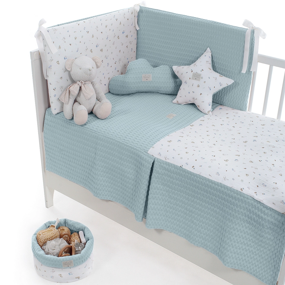 La colcha y el protector presentan un diseño totalmente coordinado, combinando el verde agua con pequeños motivos infantiles que aportan dulzura y facilitan la combinación con otros textiles y elementos decorativos.