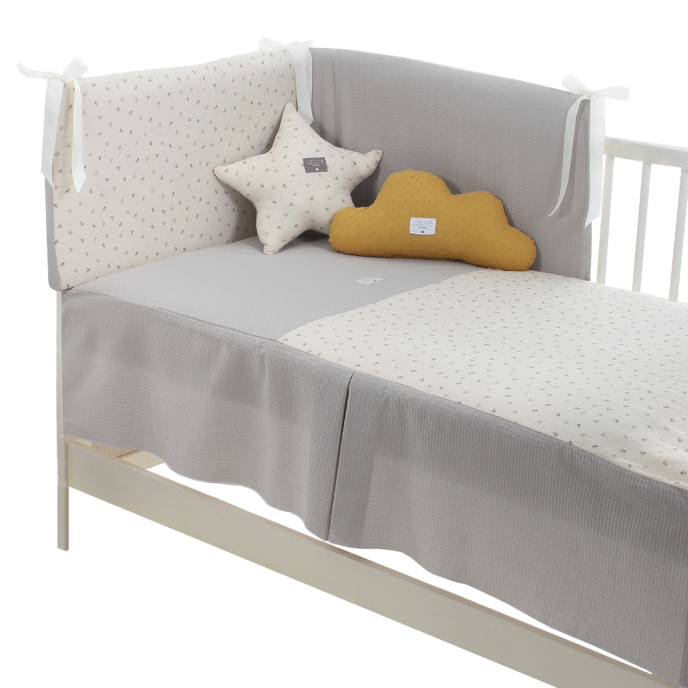 La colcha y el protector presentan un diseño coordinado en tonos grises con pequeños detalles estampados, creando un conjunto armónico, elegante y fácil de combinar con distintos estilos de decoración infantil.