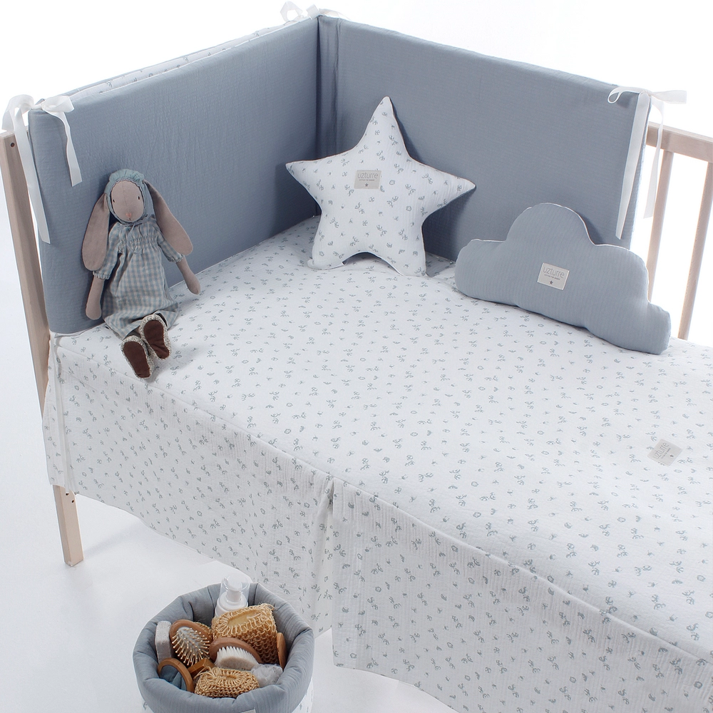 La colcha y el protector presentan un diseño coordinado en tonos azul empolvado con pequeños detalles estampados, creando un conjunto armónico, delicado y fácil de combinar con cualquier estilo de decoración infantil.