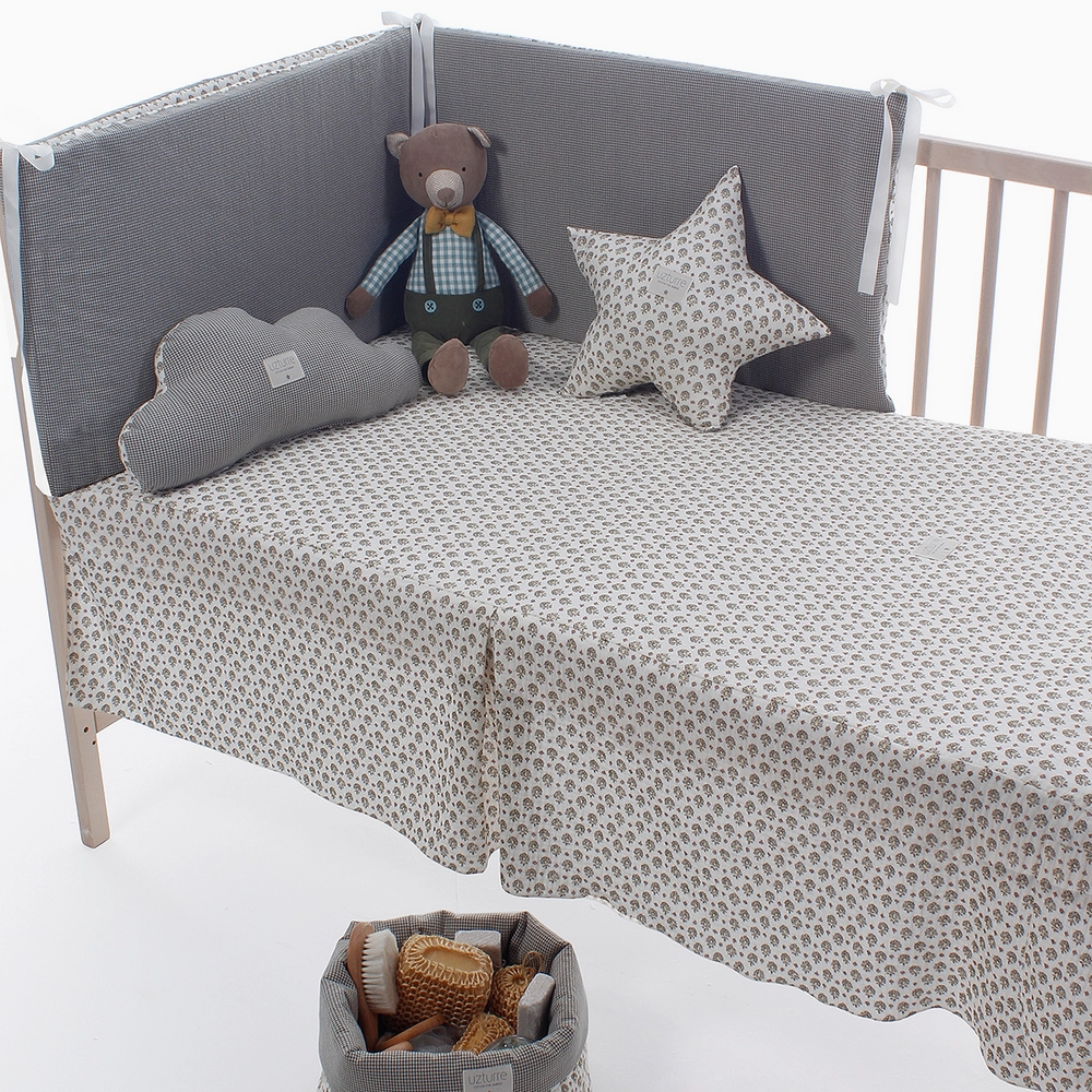 La colcha y el protector presentan un diseño perfectamente coordinado en tonos gris topo con estampado floral, creando un conjunto armonioso, elegante y atemporal que combina con distintos estilos de decoración infantil.