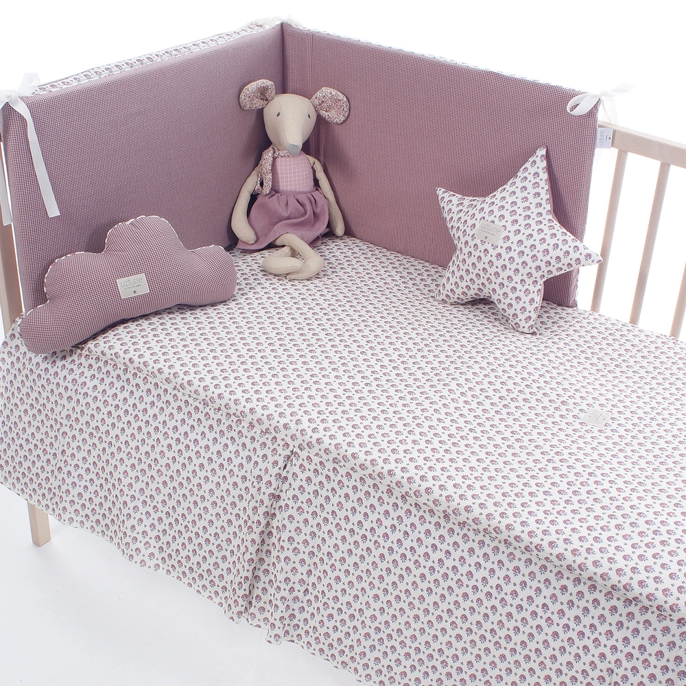 La colcha y el protector presentan un diseño coordinado en tonos rosa malva con estampado floral, creando un conjunto elegante, tierno y atemporal que combina fácilmente con distintos estilos de decoración infantil.
