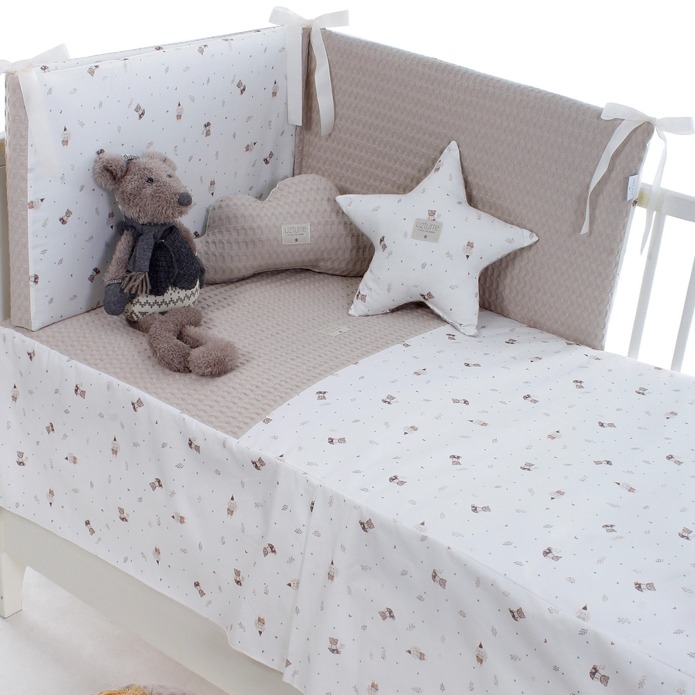 Pack de colcha y protector Uzturre para cuna de 60×120 cm en color beige topo con estampado Gaspar, desenfundables, con relleno incluido y pensados para ofrecer confort y seguridad durante todo el año.