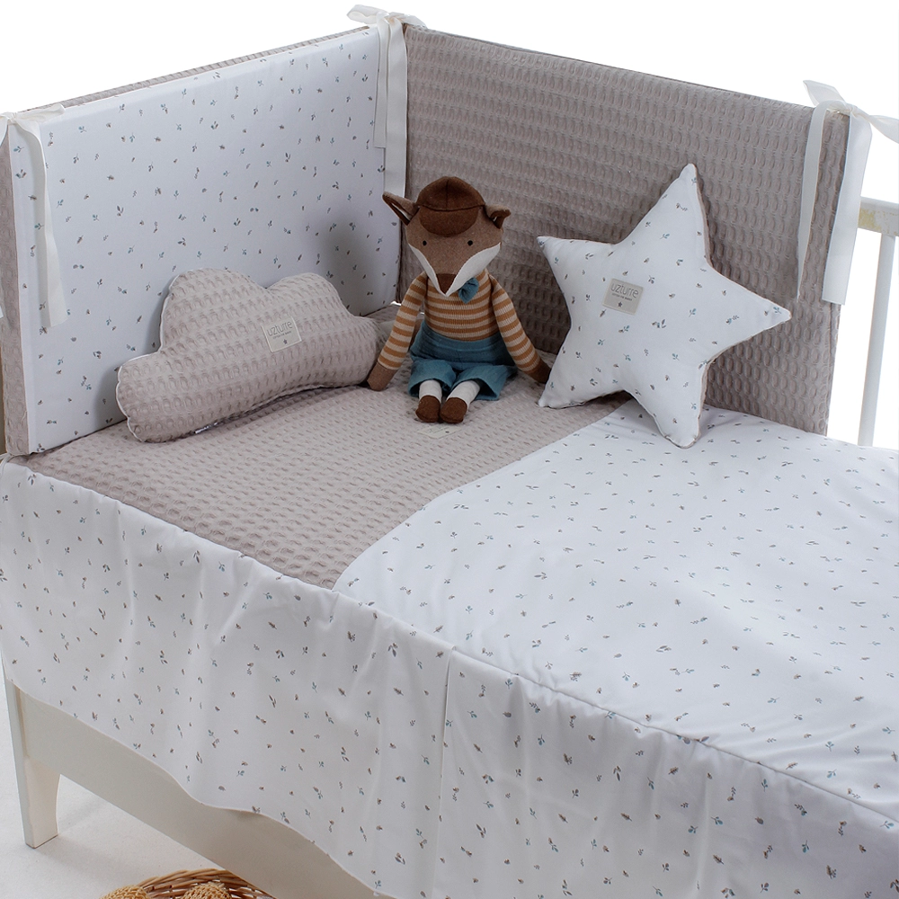 La colcha y el protector presentan un diseño coordinado en tonos beige taupe con pequeños detalles estampados, creando un conjunto armonioso, elegante y fácil de combinar con cualquier estilo de decoración infantil.