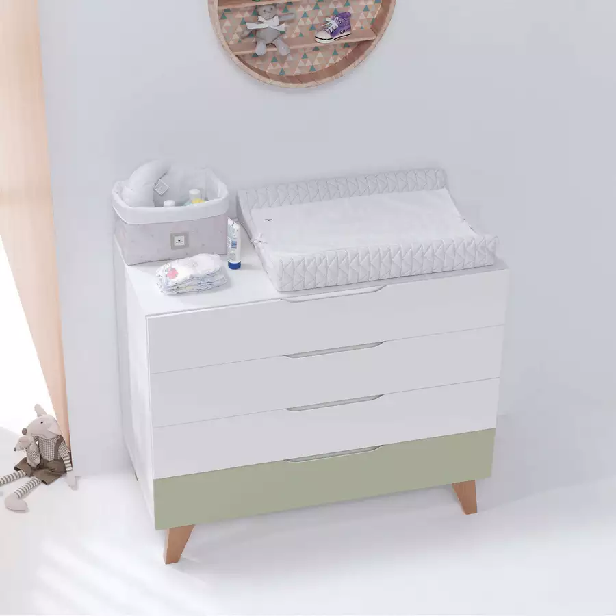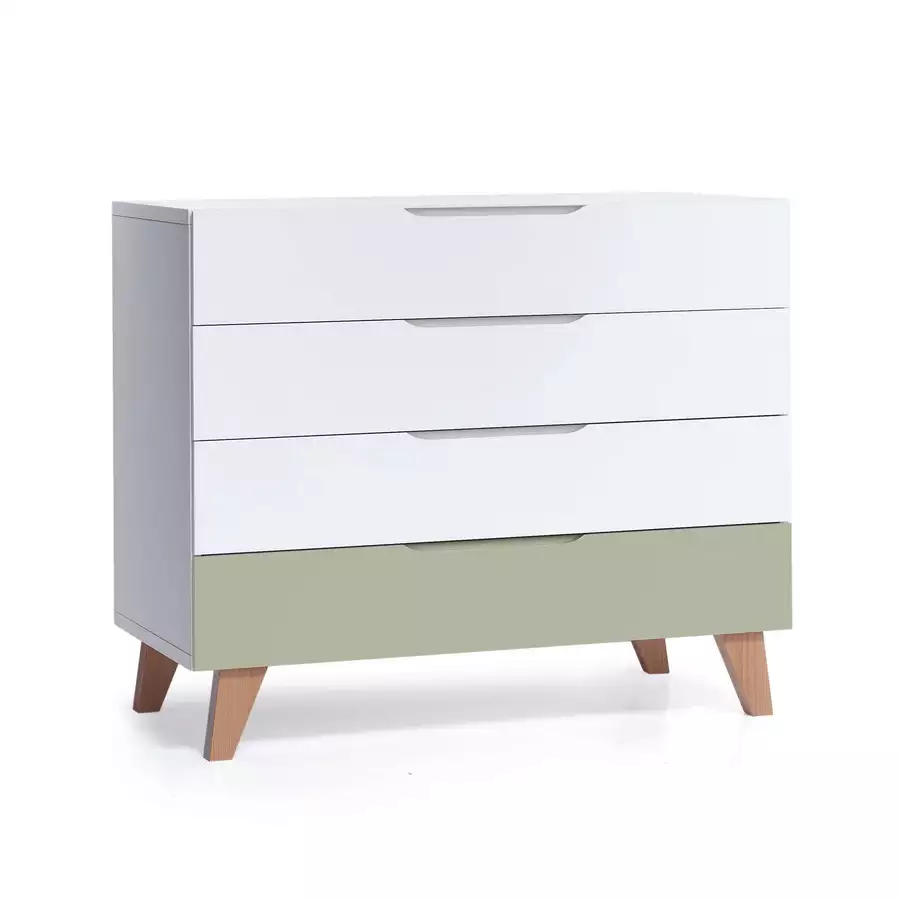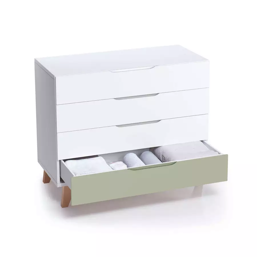 Para completar la habitación de estilo nórdico-escandinavo de tu bebé, elige la cómoda infantil Lifestyle, un mueble de diseño elegante en blanco y patas de madera, totalmente lacado. Esta cómoda de bebé ofrece mucha comodidad, gracias a que sus cajones se cierran suavemente. Moderna y original a la vez, se puede utilizar tanto para su etapa infantil como juvenil. Recuerda que también tienes la cuna colecho y el armario a juego, ¡para completar la habitación!