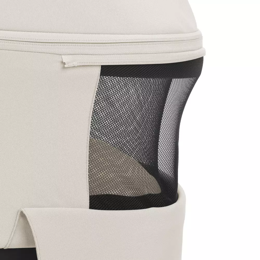 La capota extensible incorpora panel de rejilla y ventana trasera con cremallera para mejorar la ventilación. Sus tejidos exteriores son repelentes al agua, protegen del viento y cuentan con protección solar UPF 50+. Además, el tejido exterior es 100% reciclado, apostando por una opción más sostenible, disponible en pekenova.