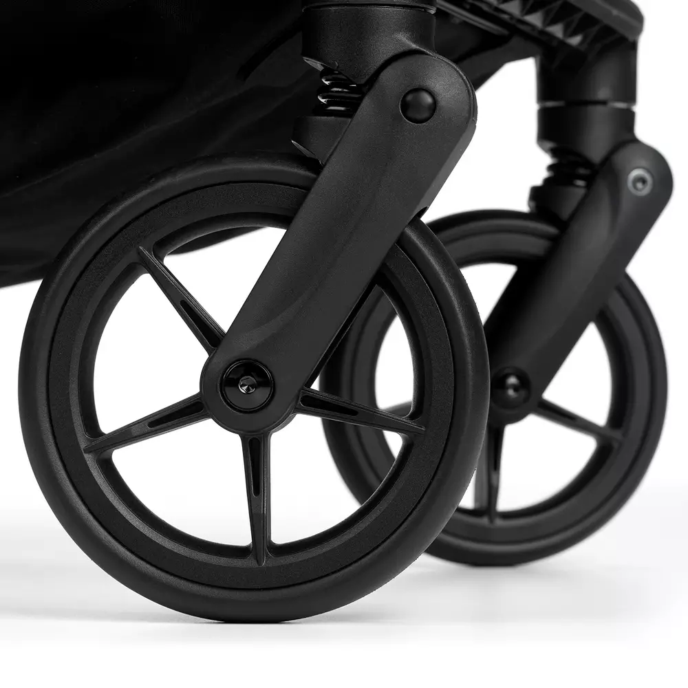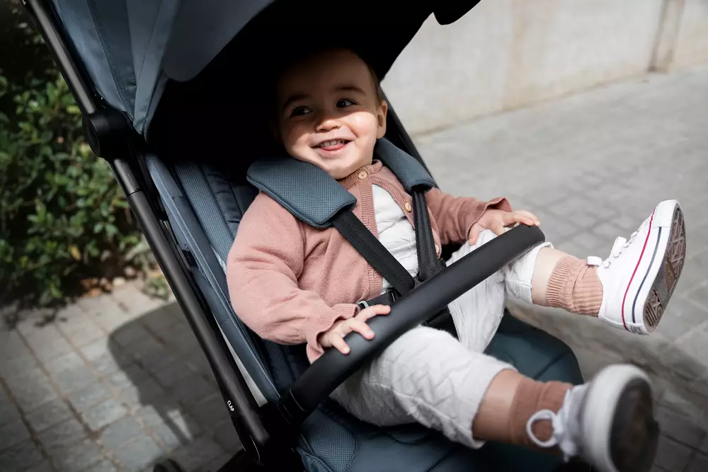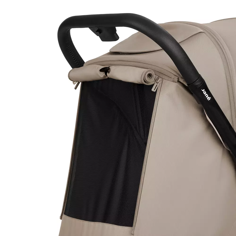 La capota plegable incluye visera extensible y ventana superior para una correcta ventilación y visibilidad. Sus tejidos son repelentes al agua, protegen del viento y cuentan con protección solar UPF 50+. El manillar y la barra protectora están acabados en polipiel con textura que mejora el agarre. Además, dispone de suspensión en todas las ruedas para paseos suaves y estables.
