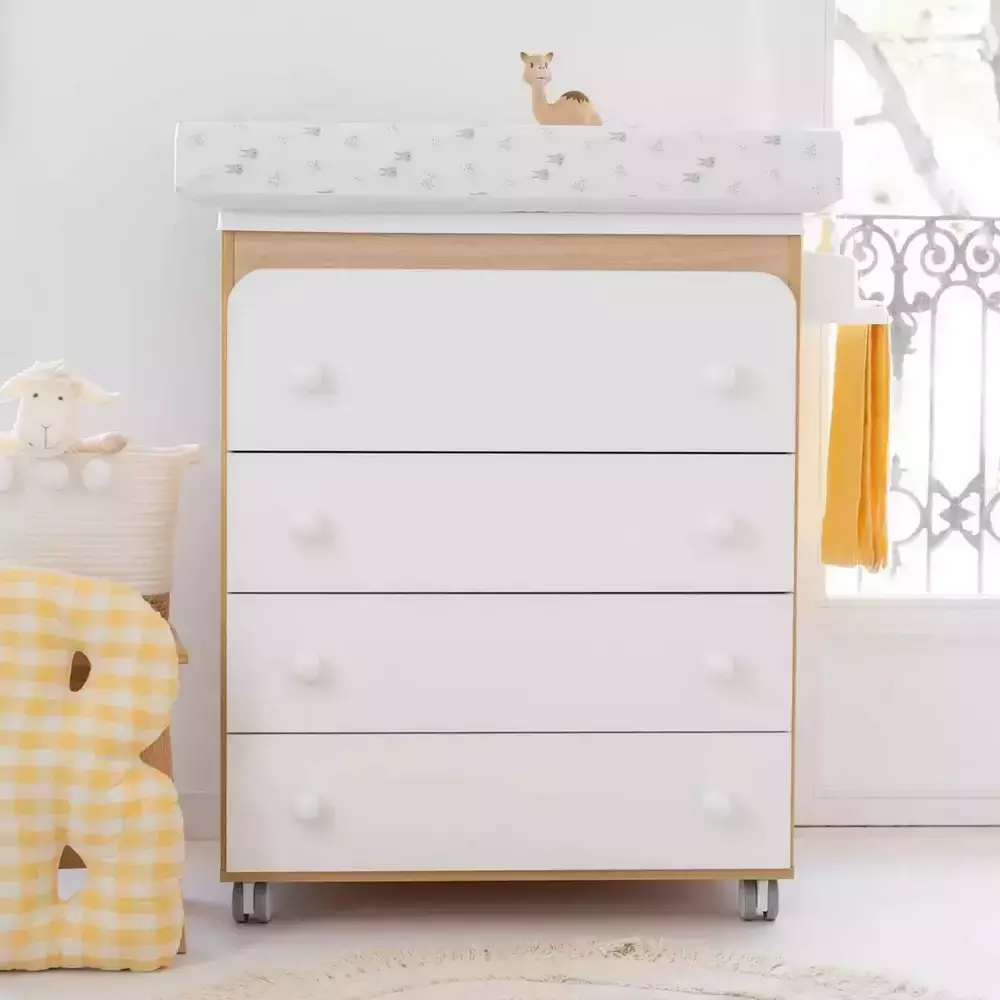 La Micuna Bañera B-1940 en acabado Madera-Blanco con tapizado Rabbits es un mueble práctico y completo que facilita el baño y el cambio del bebé durante los primeros meses. Su diseño combina zona de baño, cambiador y amplio almacenaje en un solo mueble, optimizando el espacio y el uso diario.