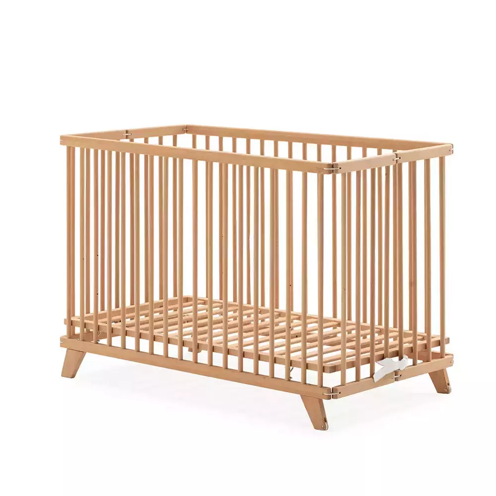 Cuna plegable práctica con acabado en madera natural