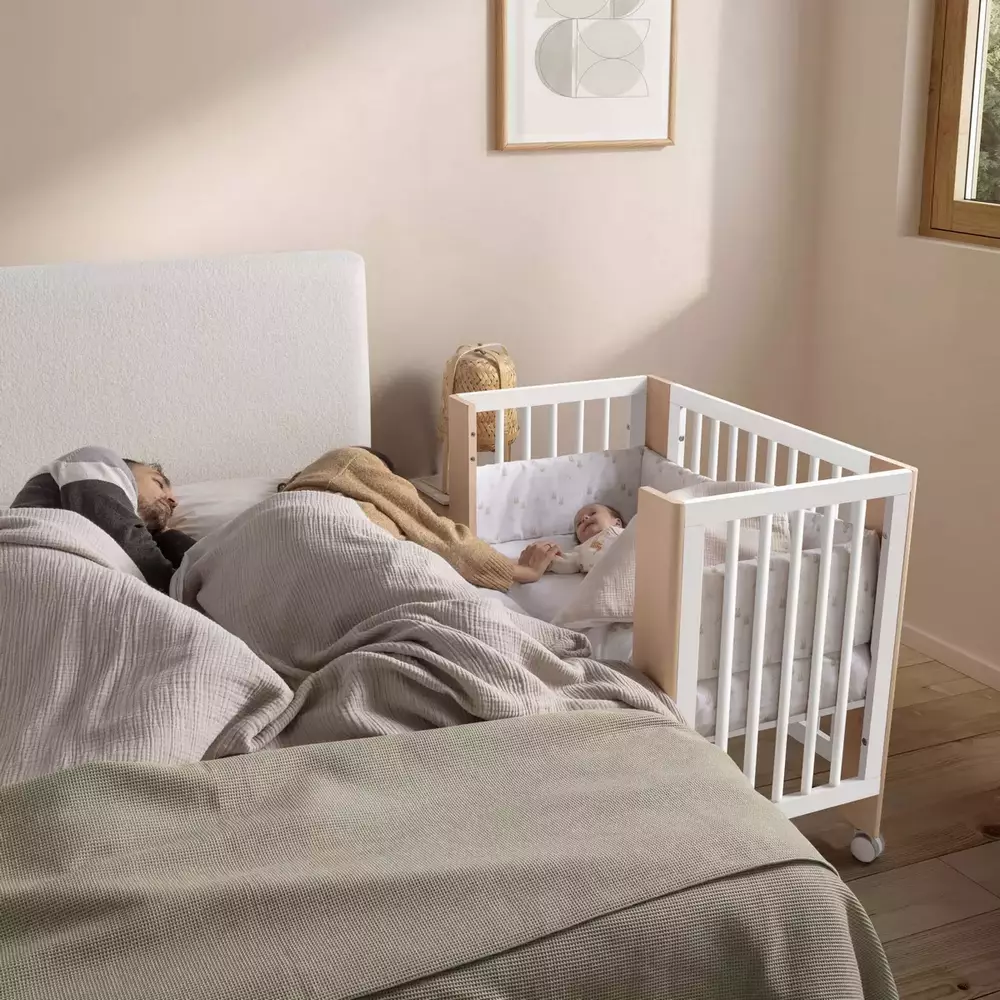 La Micuna MO-2013 Converbaby incorpora un lateral extraíble que permite su uso como minicuna colecho, facilitando las tomas nocturnas y el descanso compartido con total seguridad. Incluye correas de anclaje para la cama y un sistema de fijación fácil y rápido.